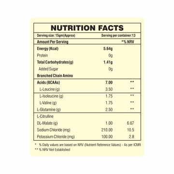 This BCAA is designed to fuel your workouts, speed up recovery, and reduce muscle breakdown. It provides the essential amino acids your muscles crave during and after intense training. Enhanced with L-Glutamine for recovery, L-Citrulline DL-Malate for improved blood flow and endurance, and key electrolytes (Sodium Chloride and Potassium Chloride) for hydration, this formula supports peak performance from start to finish. Ideal for athletes, bodybuilders, and active individuals aiming to train harder, recover faster, and stay hydrated.